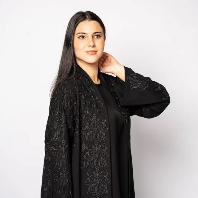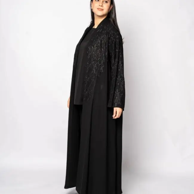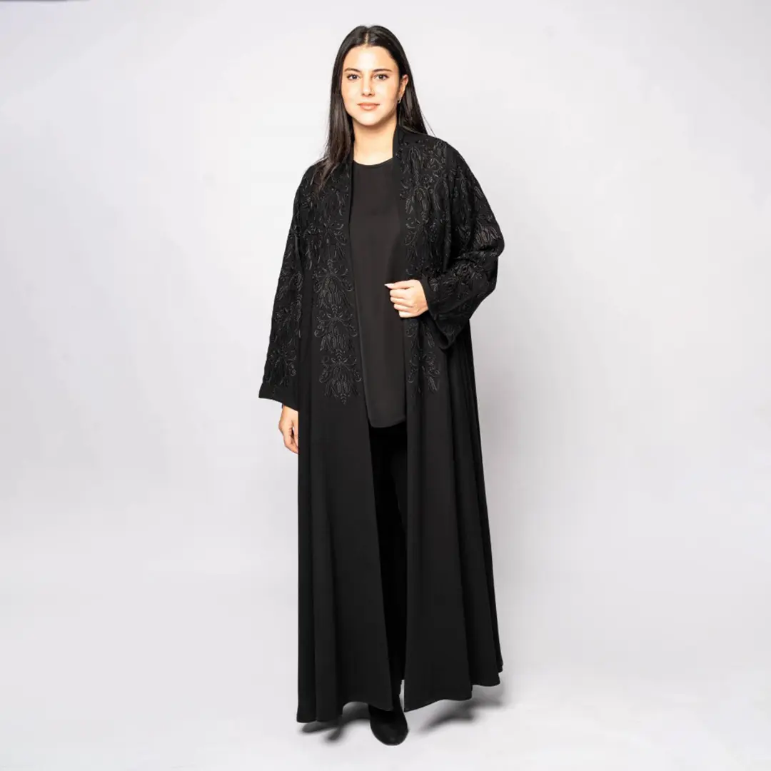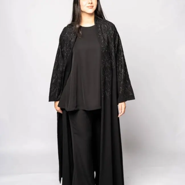 Black khalada fabric with black embroidery on the front and back.