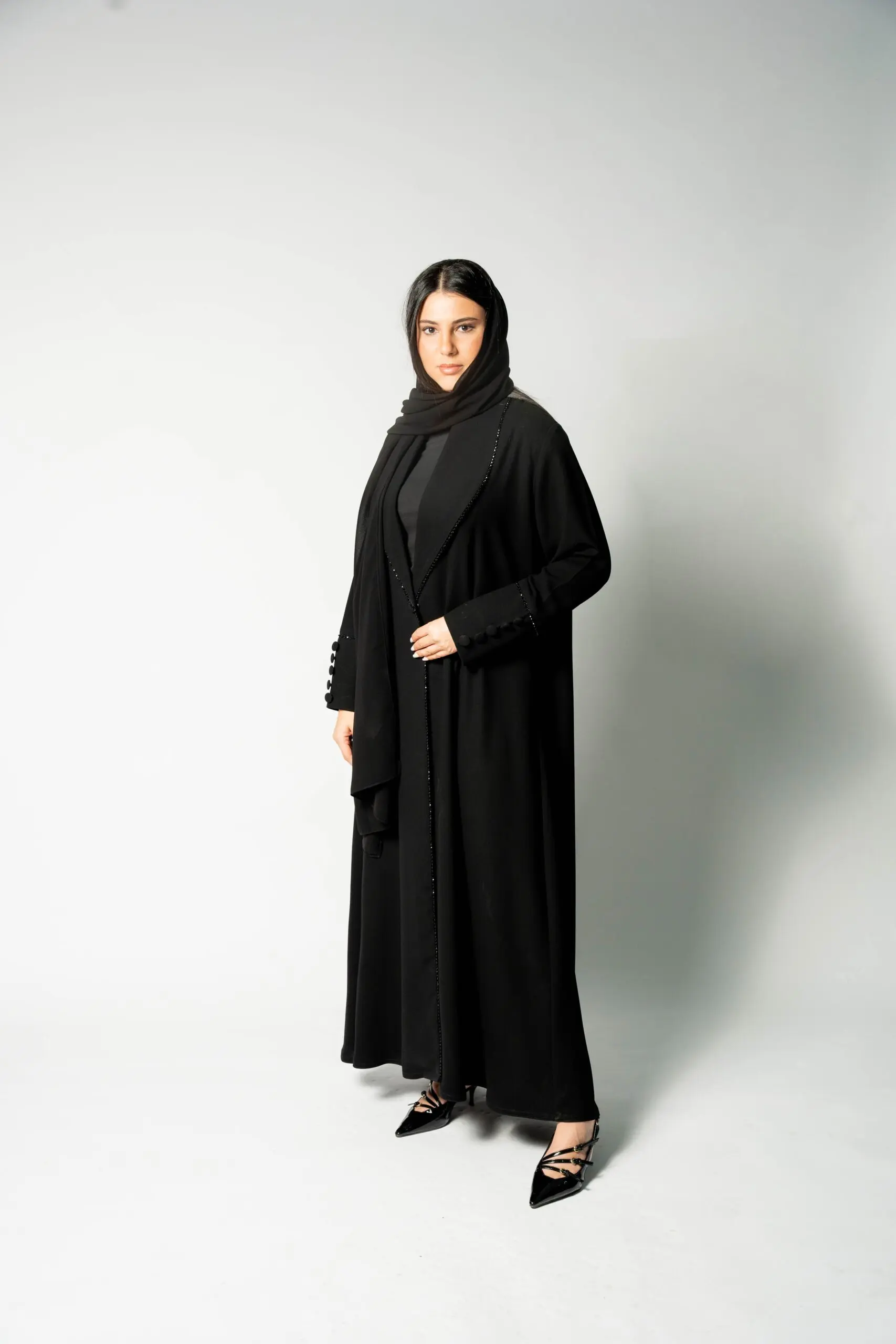 تفاصيل من الدانتيل الكريستالي اللامع من الياقة إلى الأسفل وعلى طول الأكمام